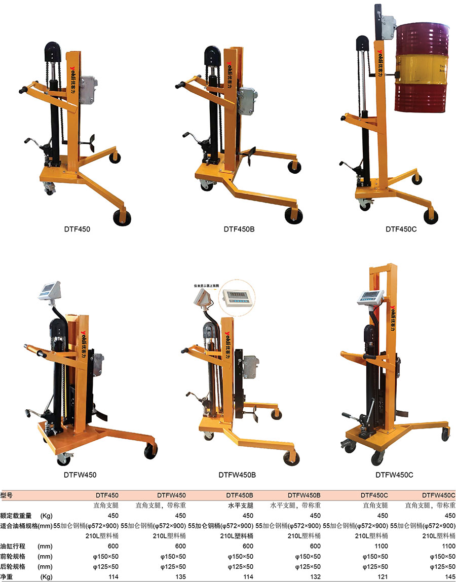 ● DTF450 DTF450C,支腿為直角型,適用于堆放在托盤邊角的油桶進(jìn)行操作,從托盤的對(duì)角線方向搬運(yùn)油桶。