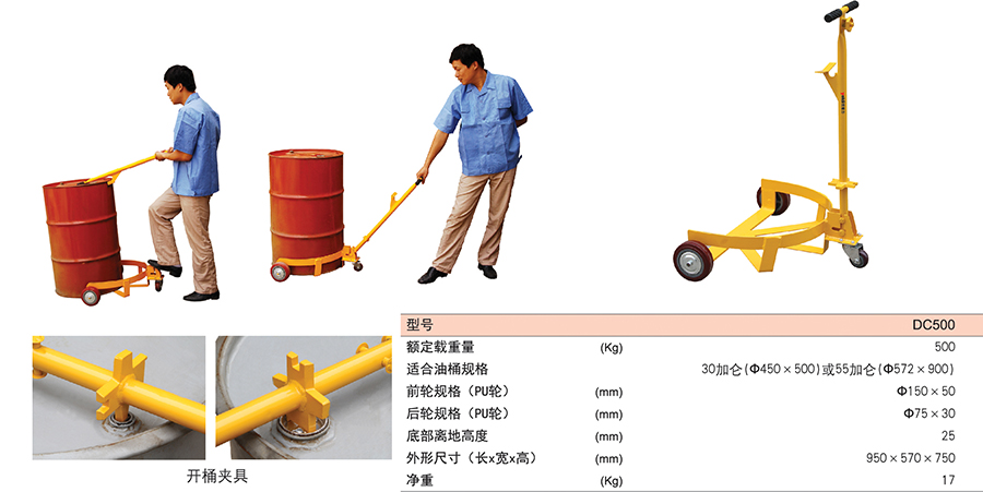 ● 手柄用做杠桿,支起油桶,推入小車即可移動(dòng)油桶。